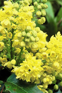 Mahonia aquifolium wordt ook wel mahoniestruik of druifstruik genoemd.